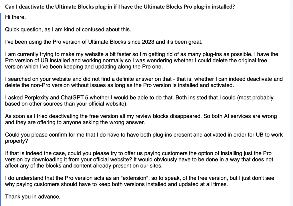 A customer had been using the Pro version of Ultimate Blocks since 2023. They loved it. But recently, they wanted to speed up their site and cut down on plugins.